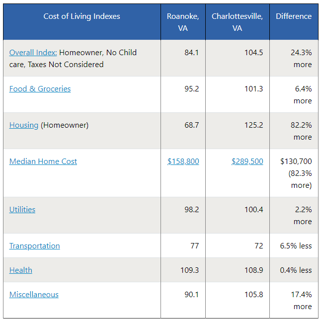 Take neighboring Charlottesville, according to Best Places, there is a 24% difference in the cost of living between the two places, yet, it’s a 120-mile difference.
